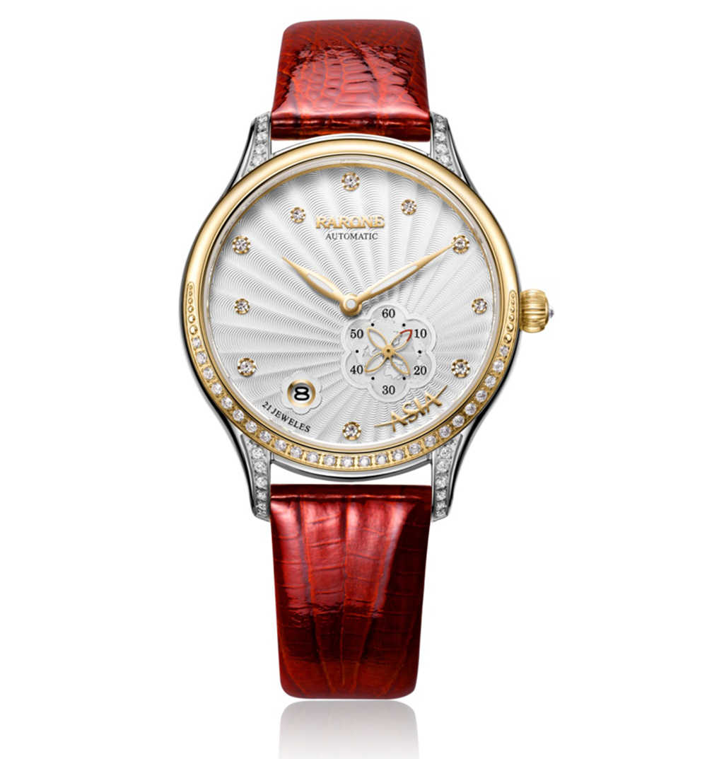 博鰲鼎智系列星月女表充分運用花瓣、星空、月牙等設(shè)計元素,結(jié)合商務(wù)腕表精簡要求,突出當(dāng)代女性的優(yōu)雅和智慧特征,充滿唯美和時尚的風(fēng)格氣息。60秒功能小眼,四葉花瓣形秒針,設(shè)計獨特,輕巧靈動;10顆水晶刻度猶如星空中點綴的繁星點點,大小不一,錯落有致,營造無限唯美的意境;表圈鑲嵌月牙形水晶石,更加閃耀璀璨。